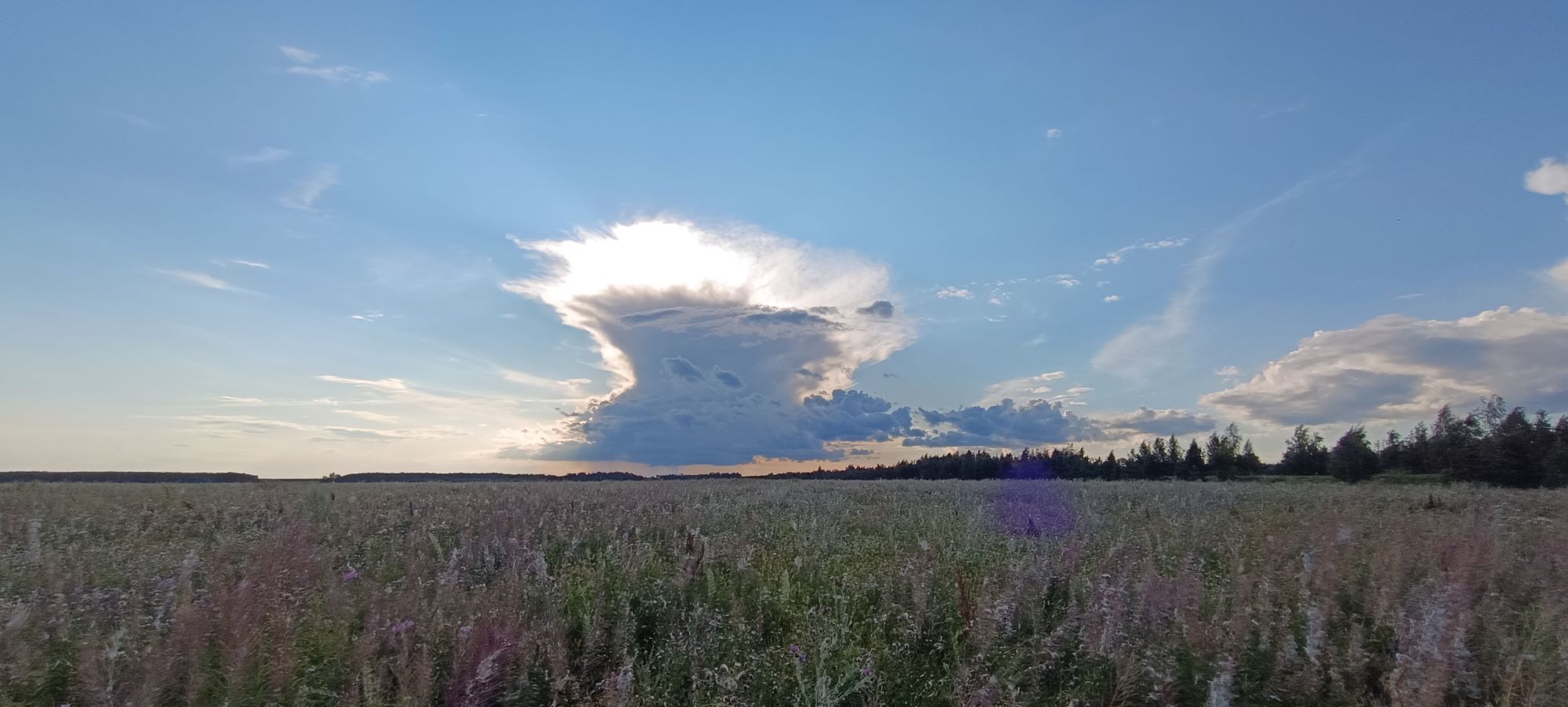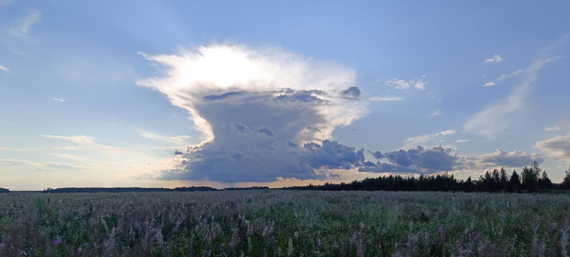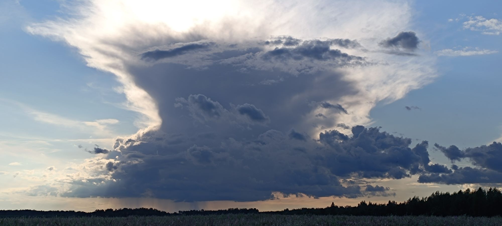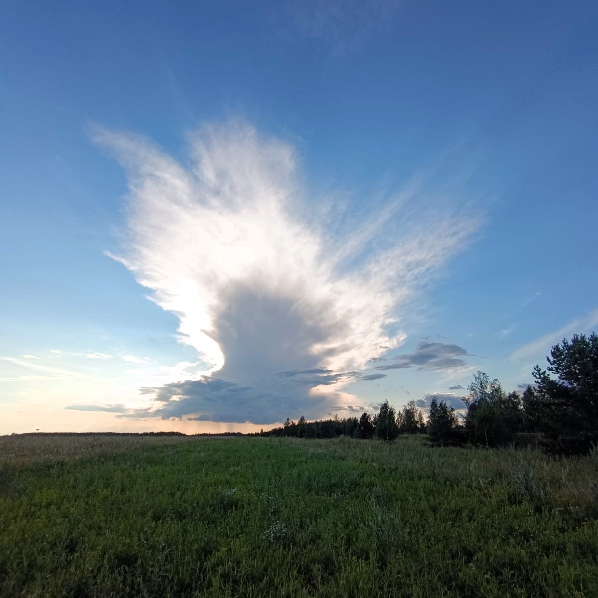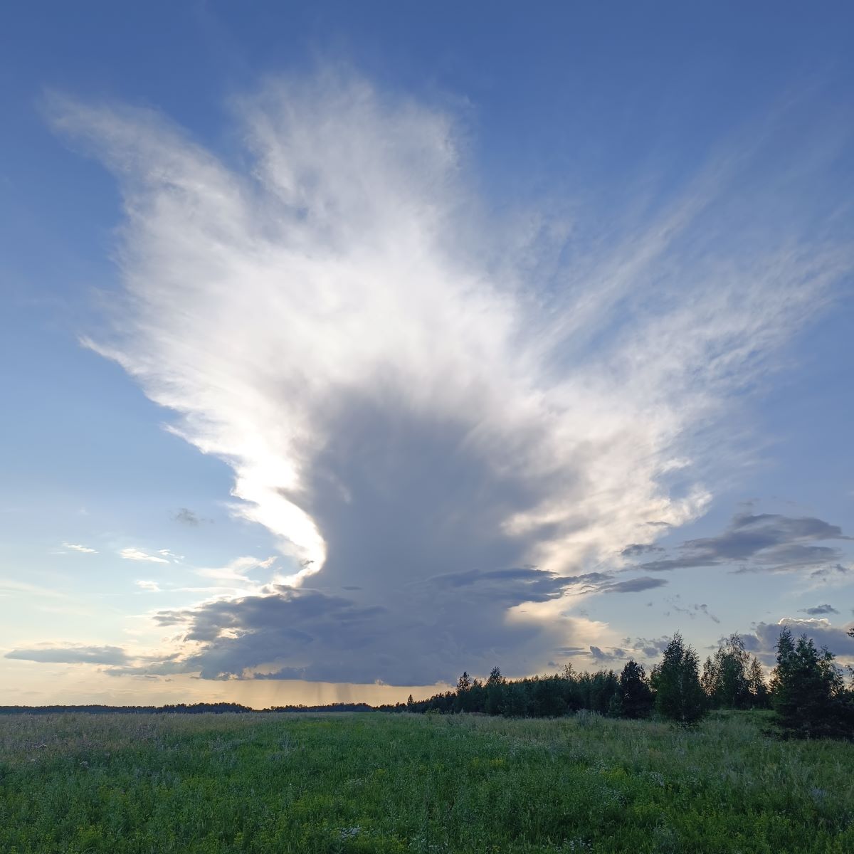 Этакое редкое природное явление на небесах – Облако-птица. Сразу после дождя из-за горизонта появилось такое облако. Облако очень быстро приближалось к нам, гонимое ветром. Но потом вдруг оно остановилось, замерло в небесном потоке. И его стало как-то сносить в сторону от нас, но было видно. Что под этим облаком идет дождь, добавляя красоты видению.