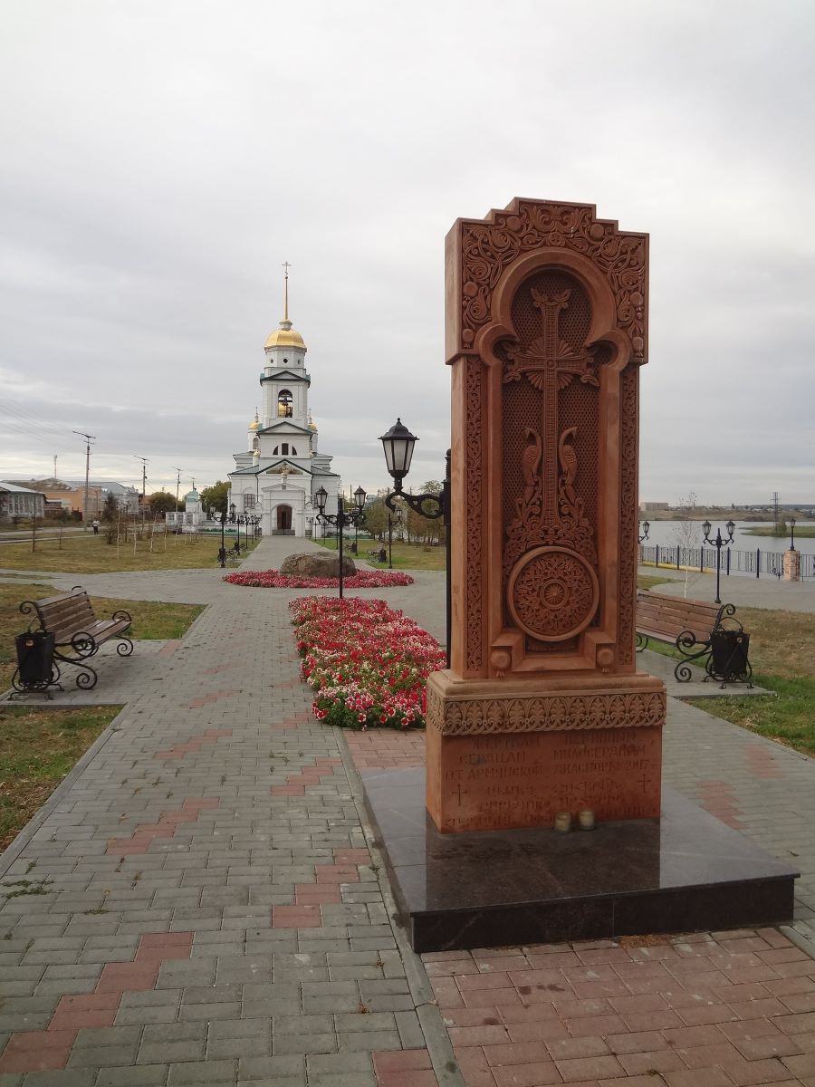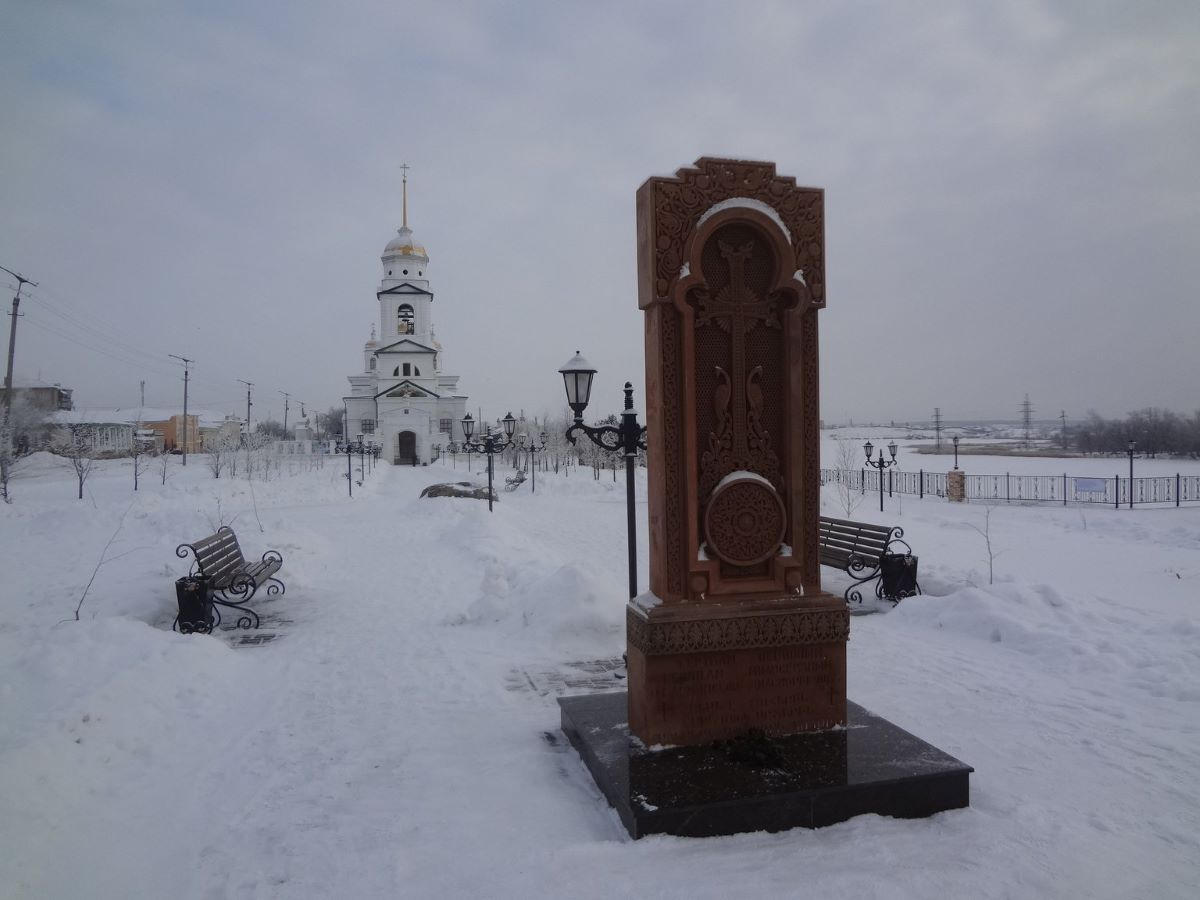 Так же зимняя пора отражена на фотографии, где находится городской кафедральный Свято-Троицкий собор, который являлся самым первым каменным зданием в деревянной крепости, с которой и начиналась история города Троицка в 1743 году. Крепость находилась на торговых караванных путях Великого Шелкового пути из стран Азии в Россию. Здесь проходила каждый год торговая и меновая ярмарка - третья по значимости в России.