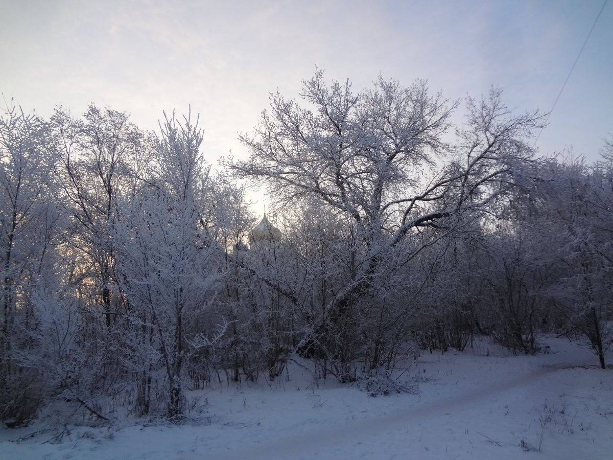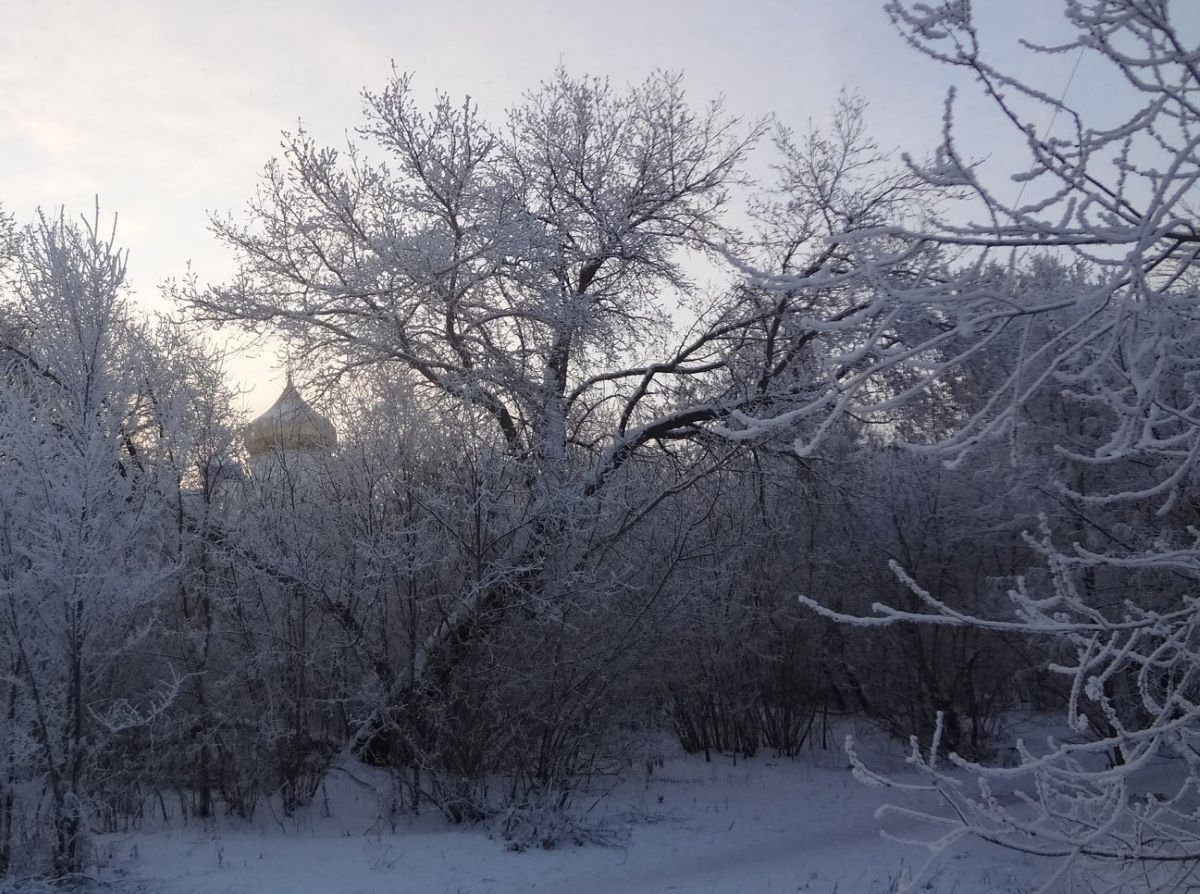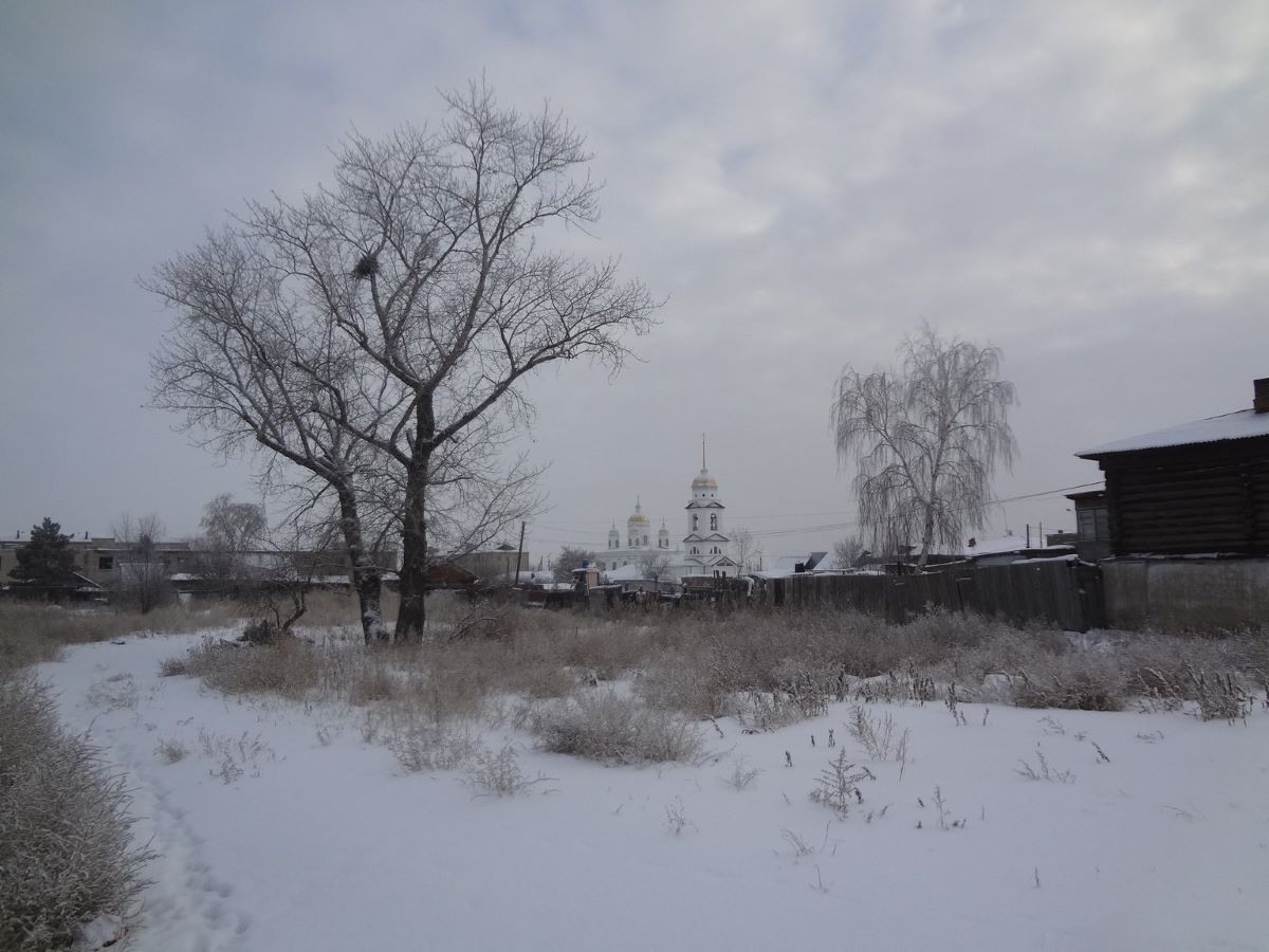 Перед нами первое фото и это Зима. Фотография сделана для того, чтобы потом с этого же места можно было сфотографировать такой же кадр, но уже осенью или летом. Думаю, что будет интересно просмотреть сразу несколько снимков, но уже в разное время года. На фотографии городской пейзаж, где главным является православный собор – то, что пока виден на заднем плане.