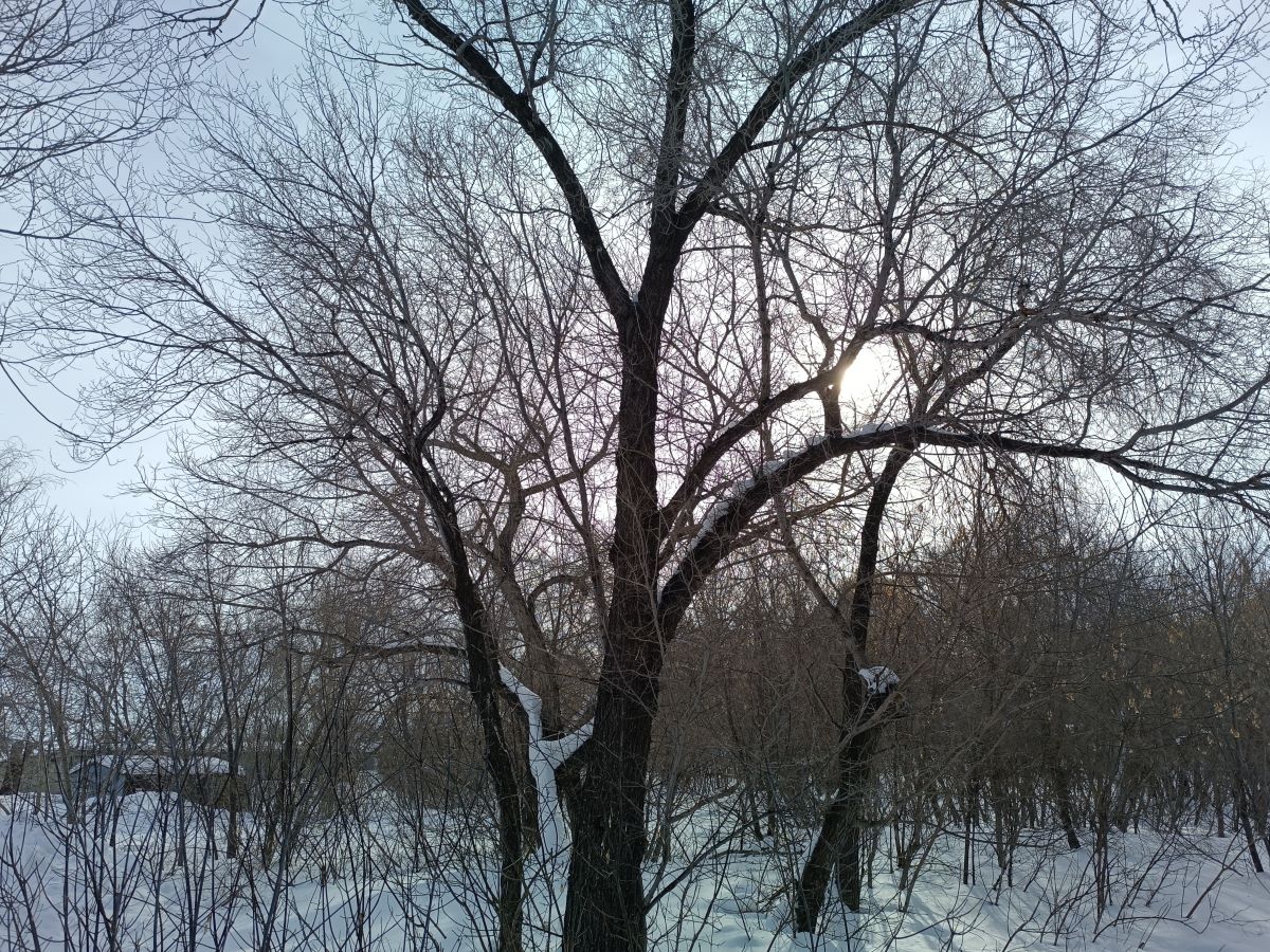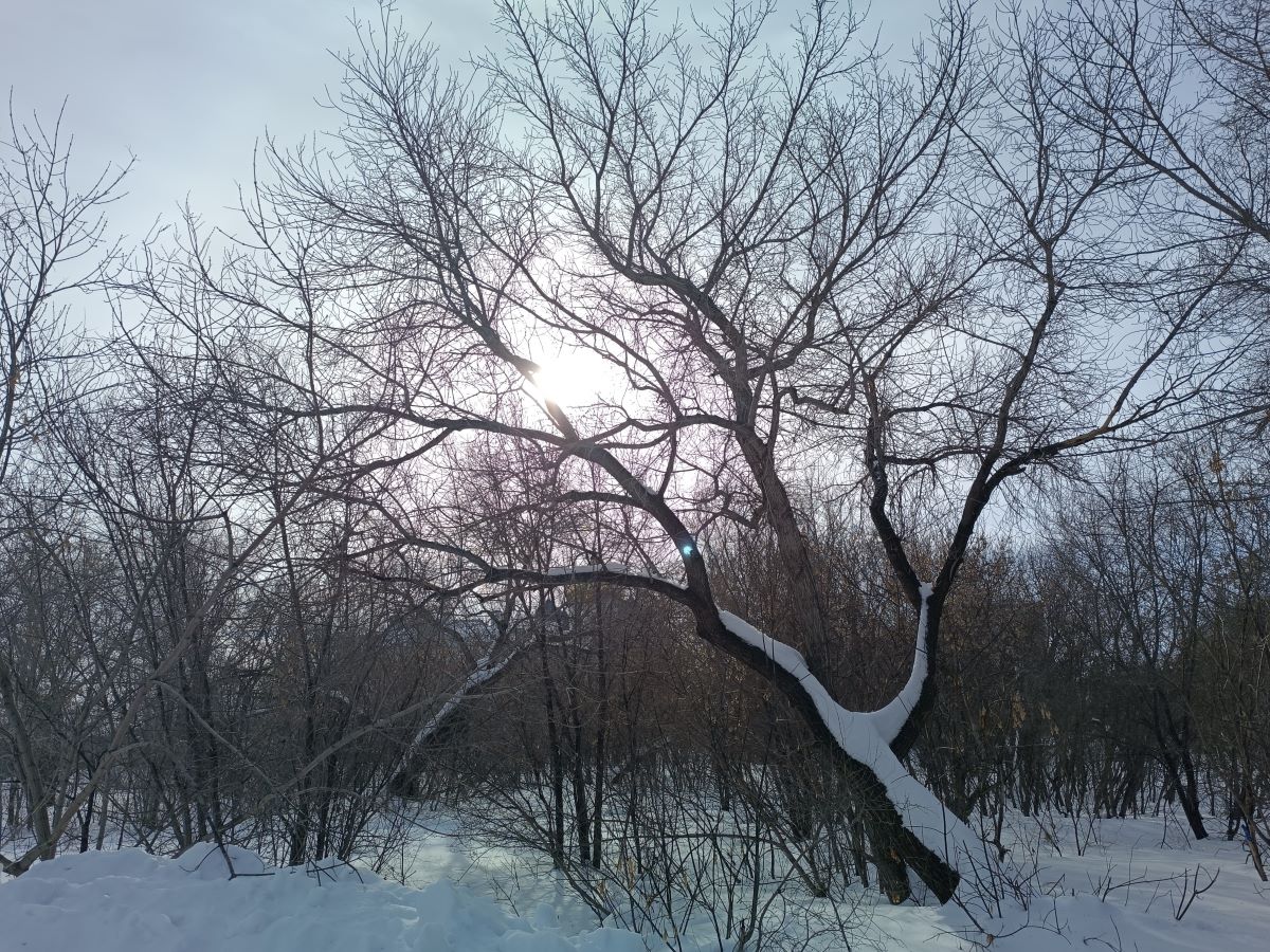 Какое необыкновенное и красивое дерево, освещенное лучами. Все это происходит утром в старом заброшенном городском парке. Именно зима и мороз сделала парк красивым – ты попадаешь в сказку.