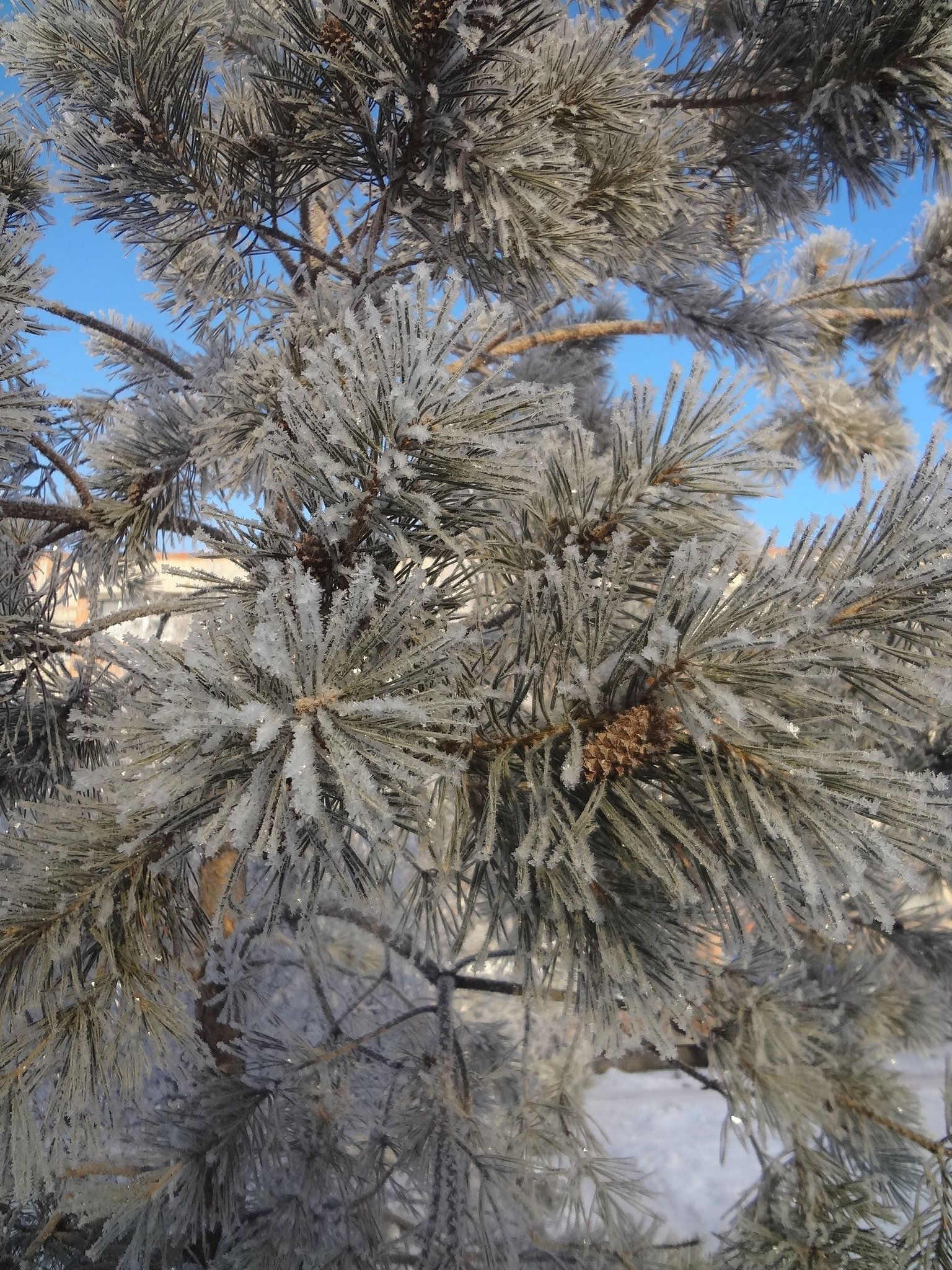 Утро, зима, сосна и ветка в инее, а на ней еще и шишка спряталась. Вот такую красоту можно увидеть на городской улице каждый день. Как может фотограф пройти мимо такой красоты зимнего пейзажа?