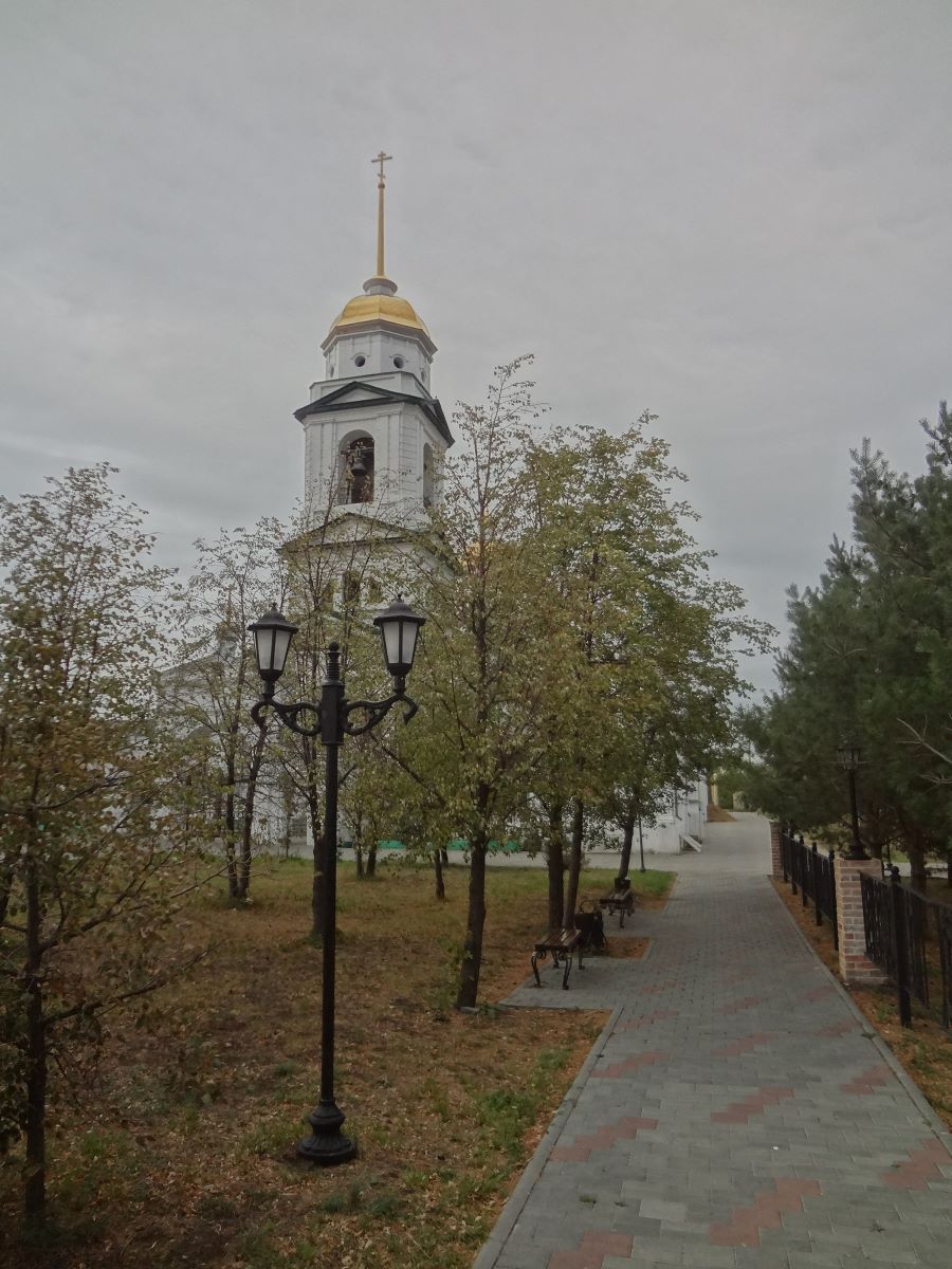 Довольно неплохая уличная фотография осеннего городского пейзажа. Храм и близлежащие деревья осенью в золотой палитре. Пасмурно, солнца совсем нет, погода очень холодная, но красота есть и в этом.