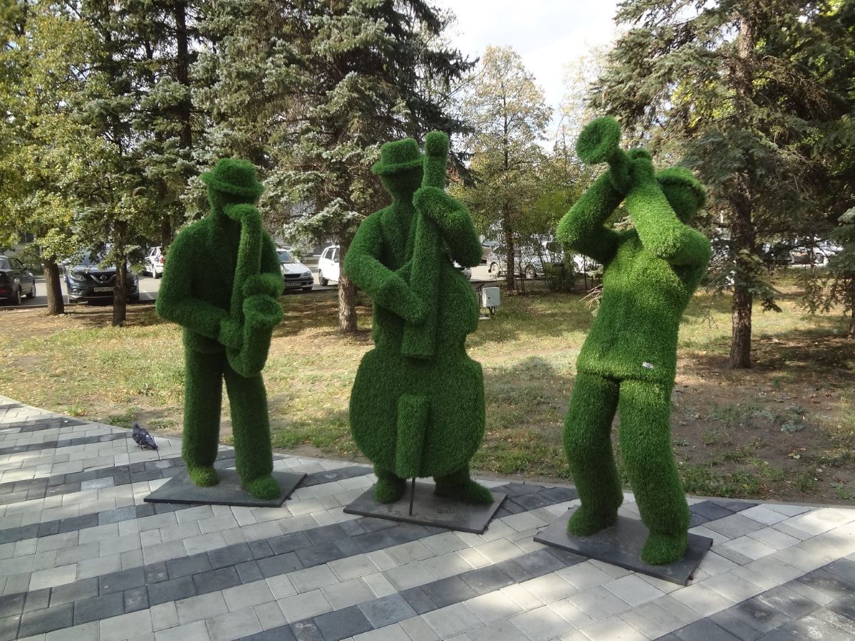 Давайте начнем прогулку и уличную фотосъемку с «уличных музыкантов». Такая зеленая скульптура или арт-объект в центральном парке города. Рядом есть музыкальная школа и художественная школа.