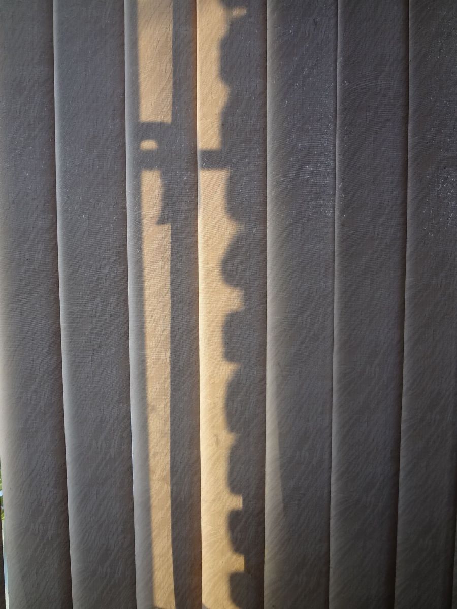 Мы видим вертикальную длинную тень на фотографии, где все в линию. Эта тень на оконных жалюзи, все по вертикали и все в длину и вверх. Тень исходит от солнечных лучей, когда солнце еще только появилось.