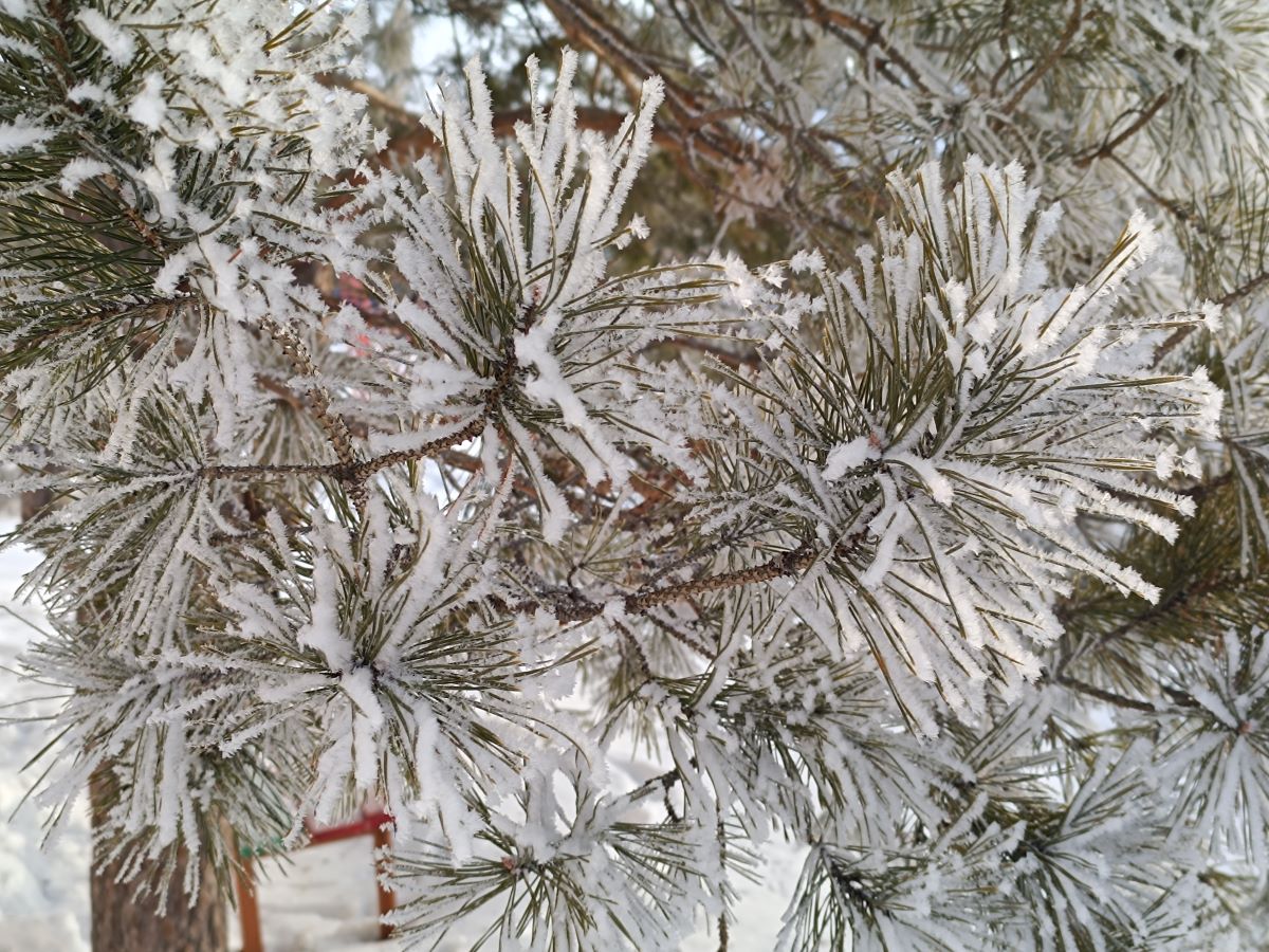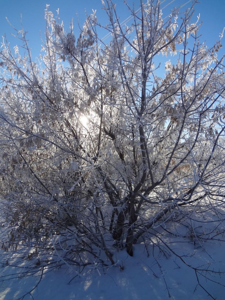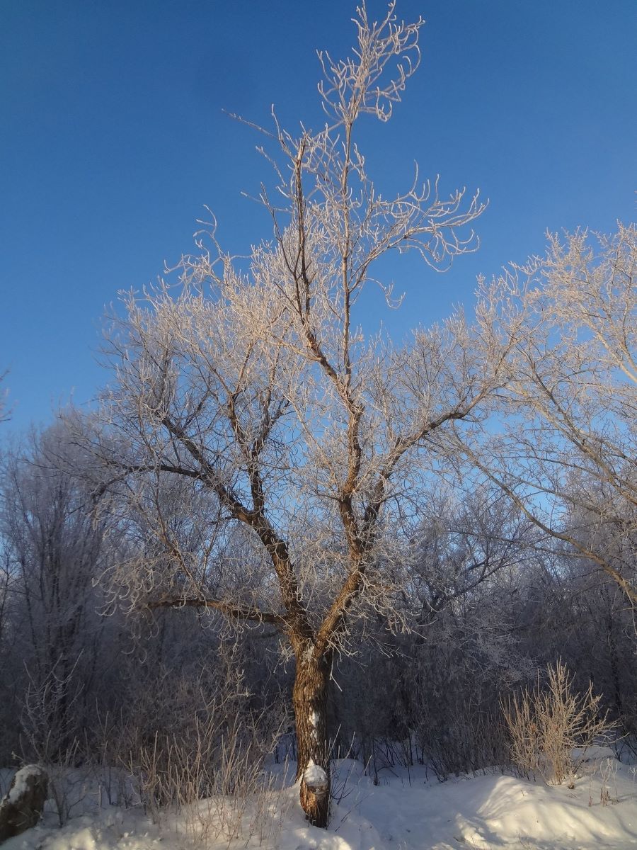 А здесь, только посмотрите, как это красиво в этот ранний час! Такая настоящая зимняя картина на этой фотографии перед нами. И само дерево все в инее, словно это хрустальная сказка утром.