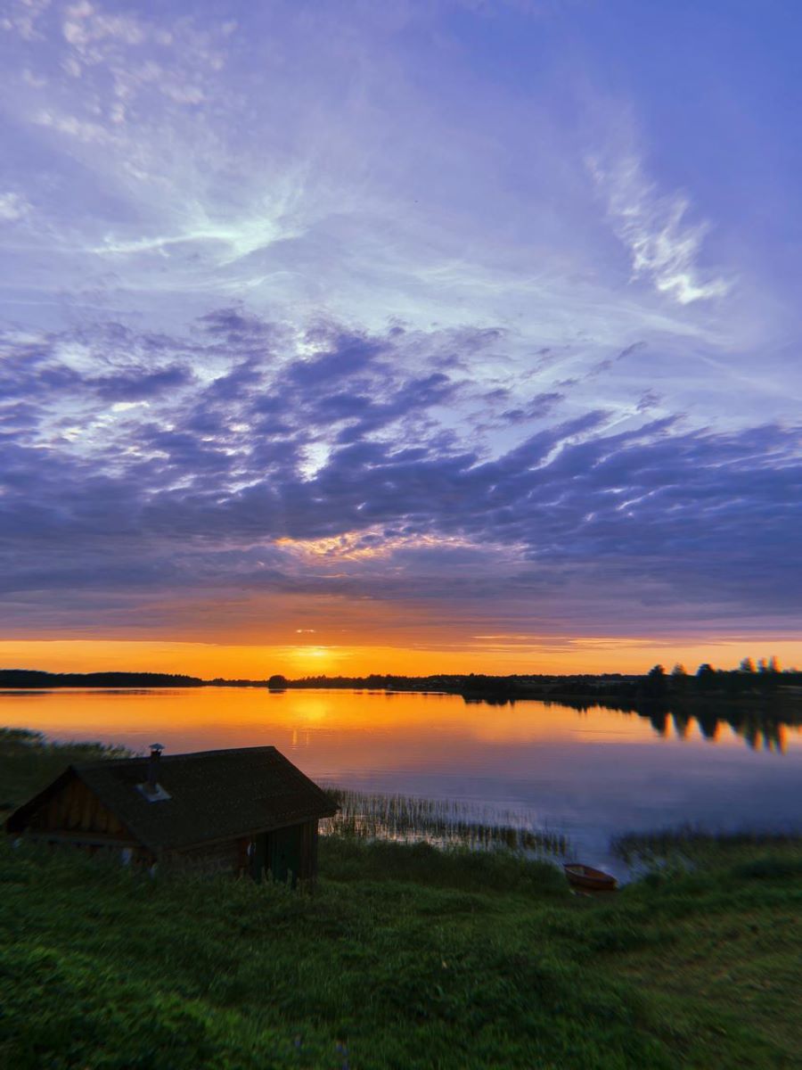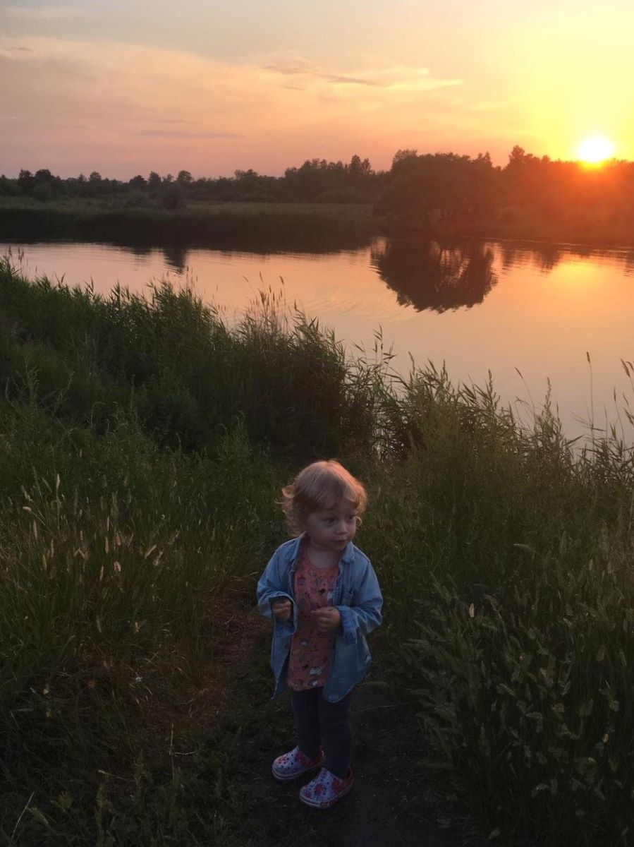 Что может быть прекраснее летних закатов на реке? Дети радуются и бегают по берегу реки. Детям также удалось собрать букет цветов.