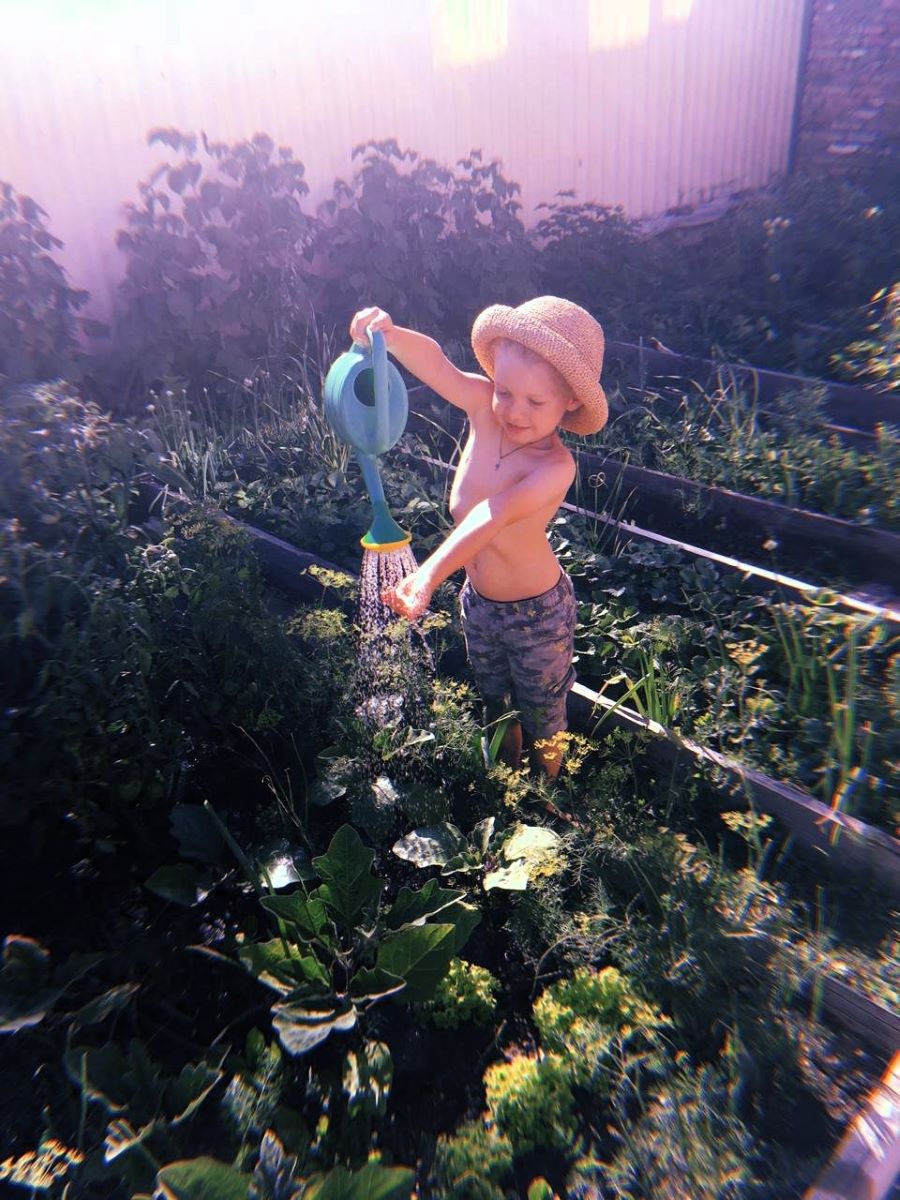 Даже летом вы можете заняться чем-нибудь в саду в деревне. Вот внук помогает поливать грядки в саду. И в этой работе тоже есть своя игра для детей.