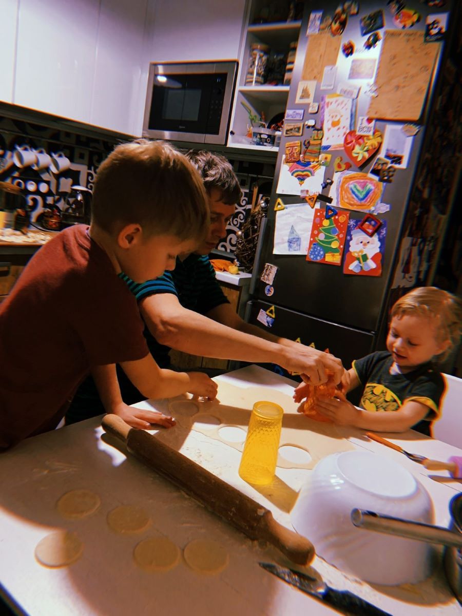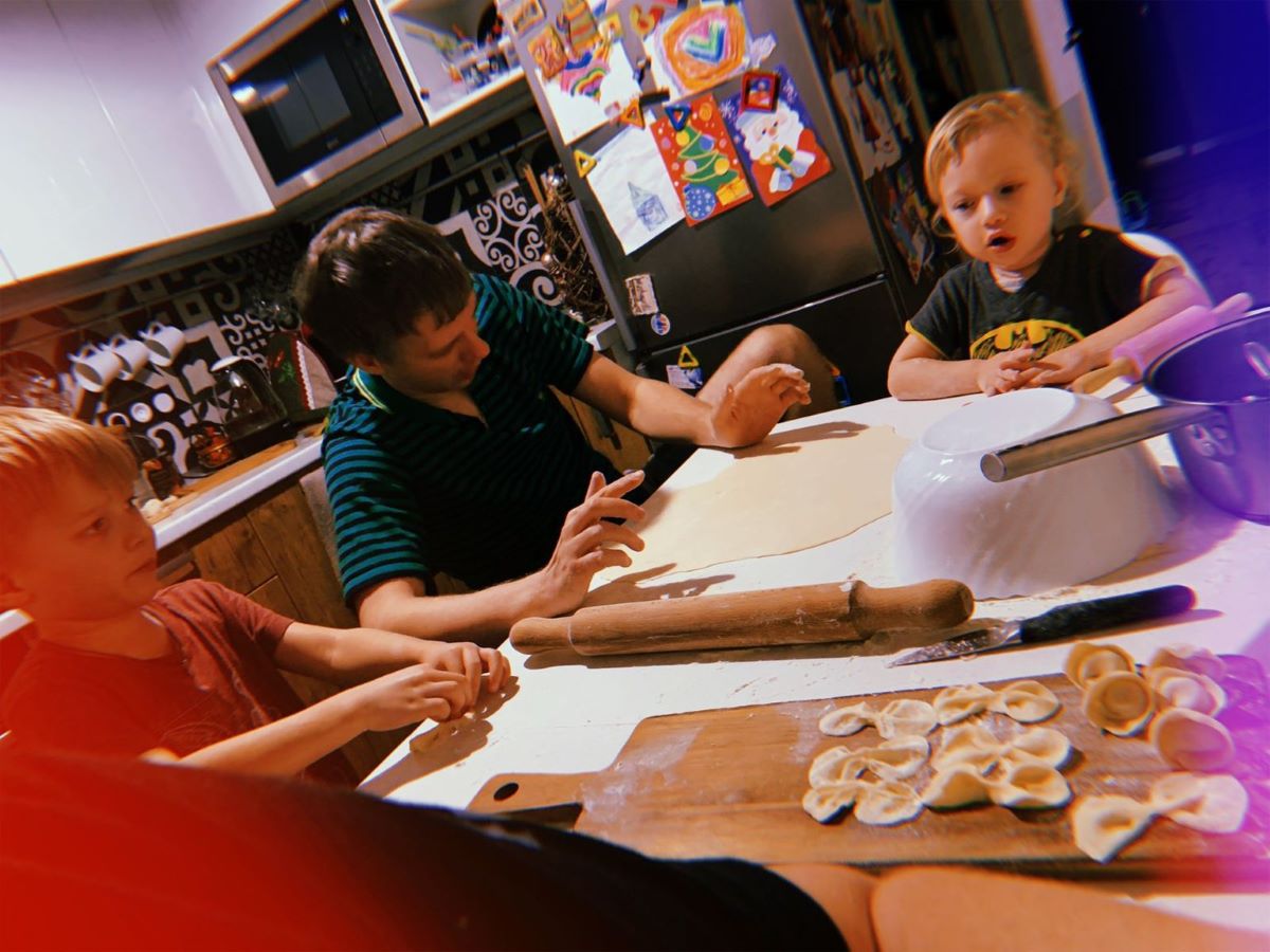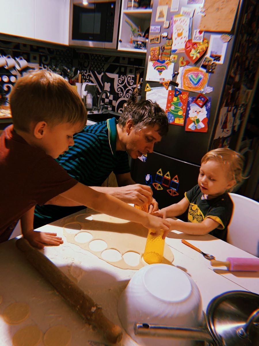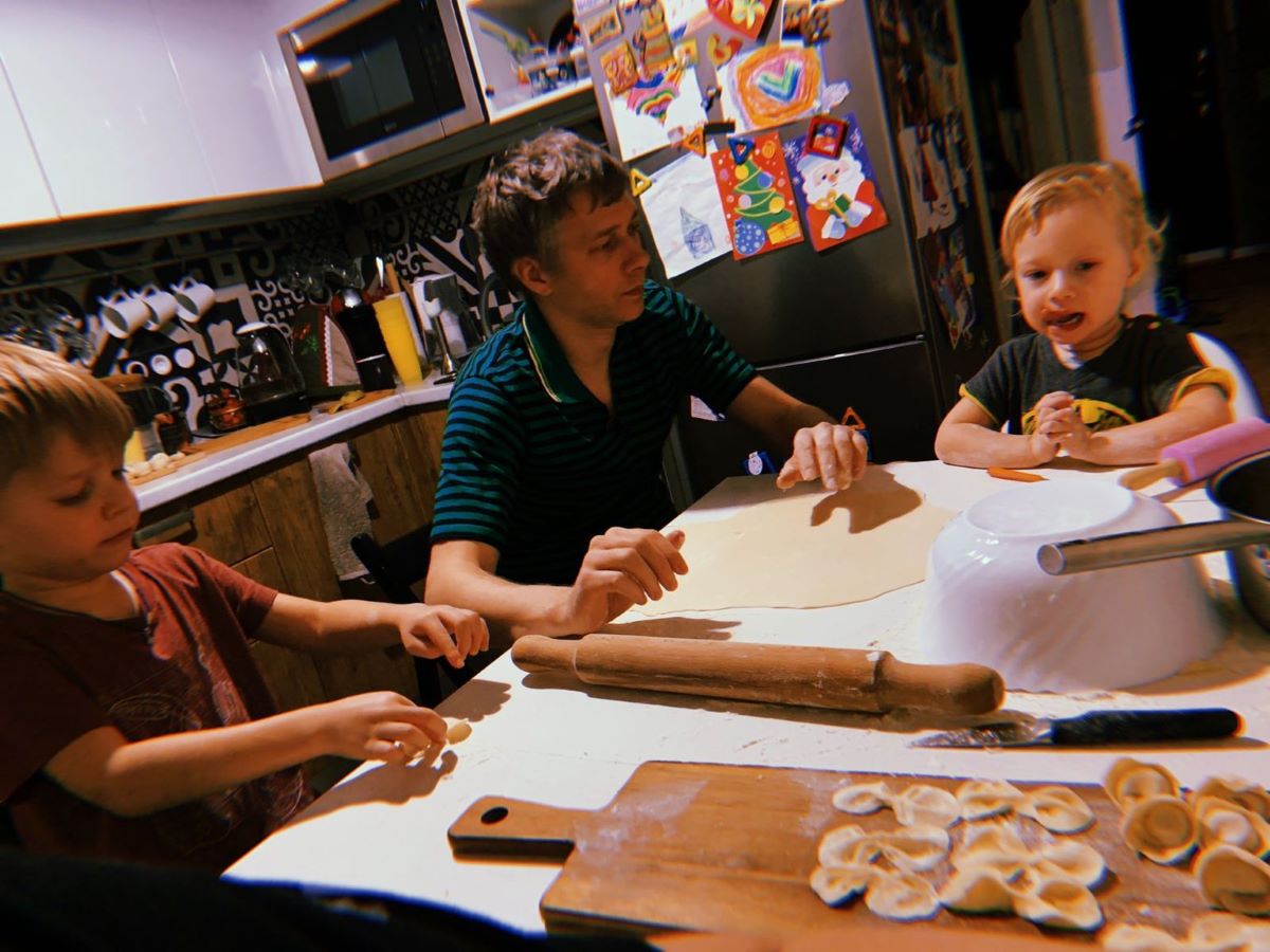 Папа детям (нашим внукам) показывает, как готовить надо пельмени. Заготовки для пельменей, чтобы потом положить правильно начинку. Дети просто наслаждались процессом, для них все было интересно.