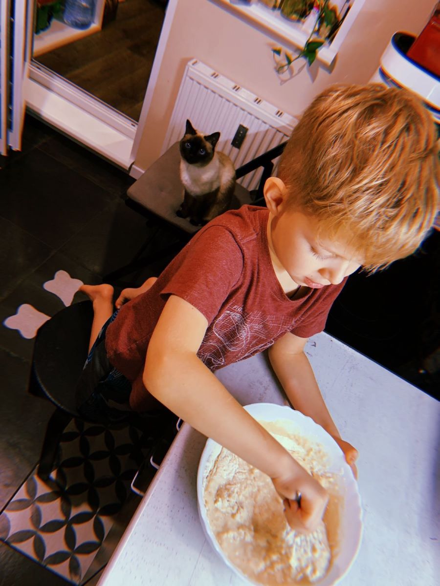 Ну, а здесь мой внук готовит муку для этого всего этого процесса. А его любимый кот наблюдает за ним внизу, но молчит, не мяукает. Коту очень любопытно, что он там делает? И не уходит никуда.