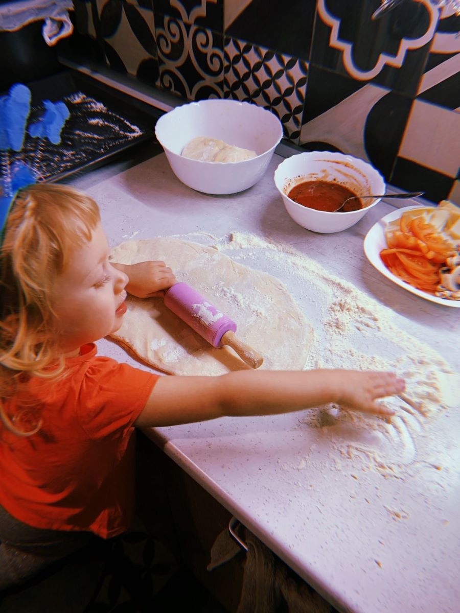 И вот внучка снова за работой, в руках рабочий инструмент - скалка. Она сразу много раскатывает теста, как для пиццы, так и пельменей. К тому же она уже знает вкус всего того, что скоро ее ждет на ужин.
