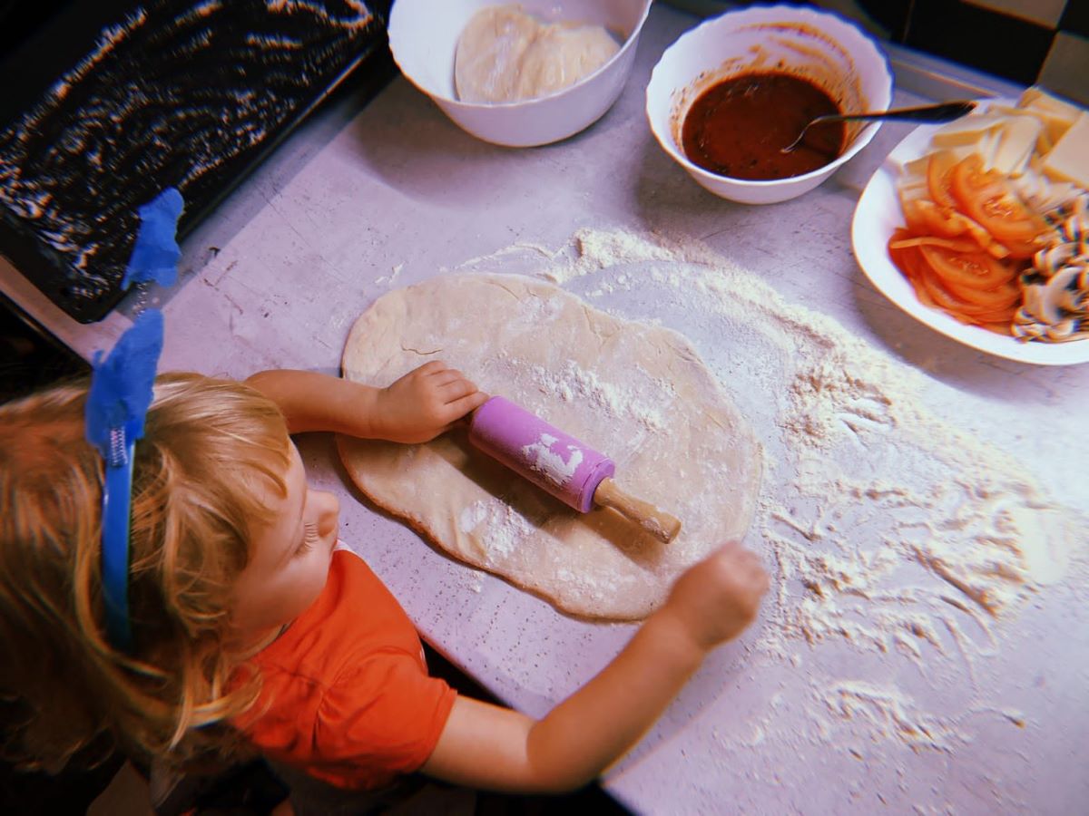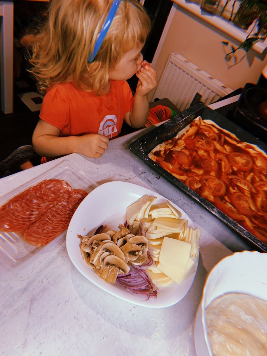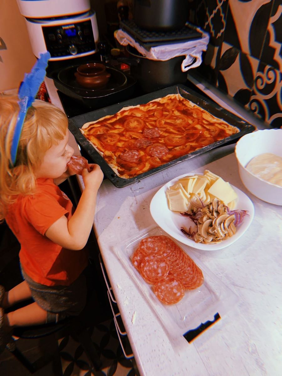 Вот моя внучка пробует начинку, где уже есть много чего для пиццы. На фотографии видно, что начинка такая вкусная, сто не оторваться. В итоге – одобрение получено и, значит, можно готовить вкусняшки.