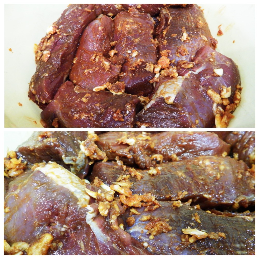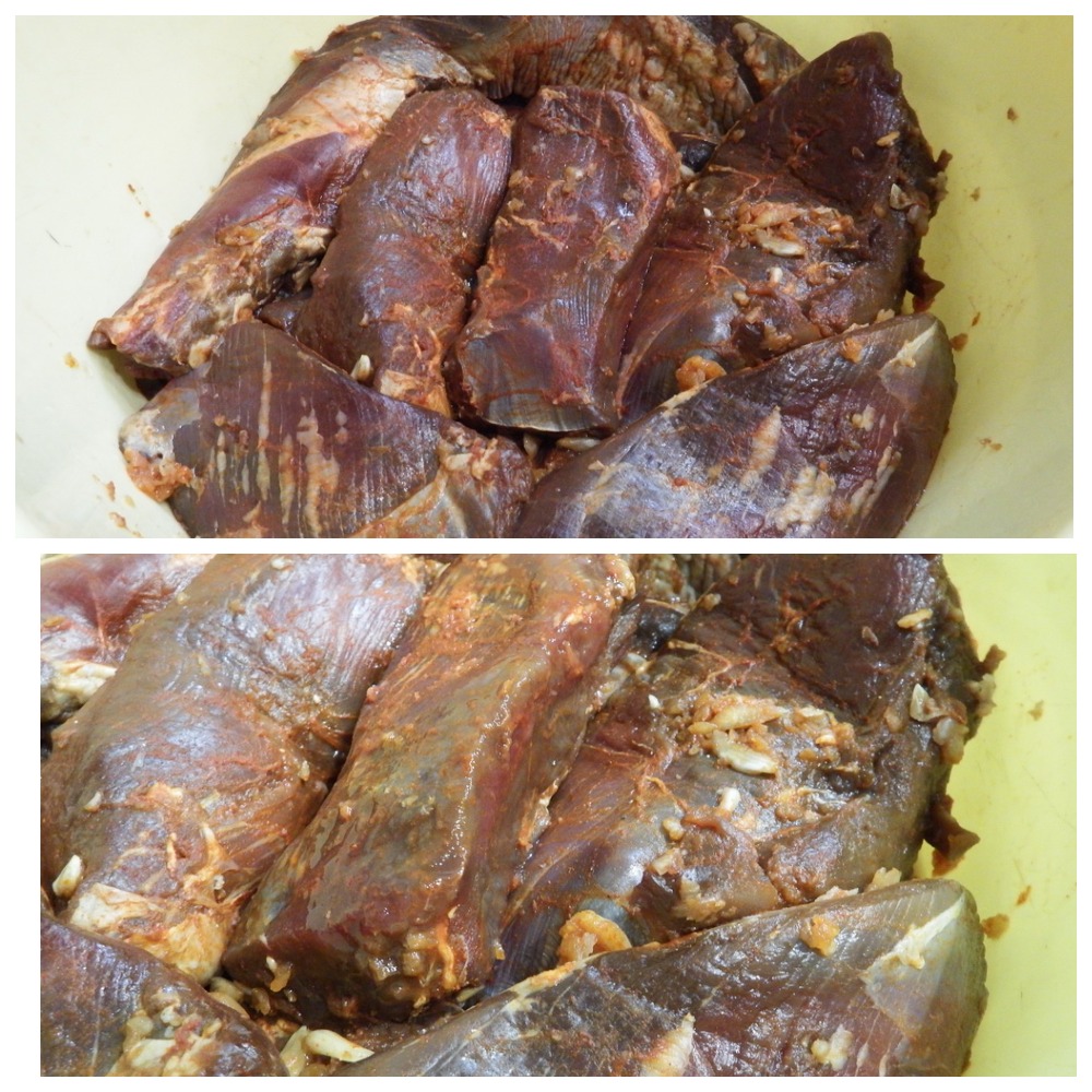 Теперь каждый кусочек натираем приготовленной смесью и складываем в какую-нибудь емкость для маринования не более чем на 3-4 дня.