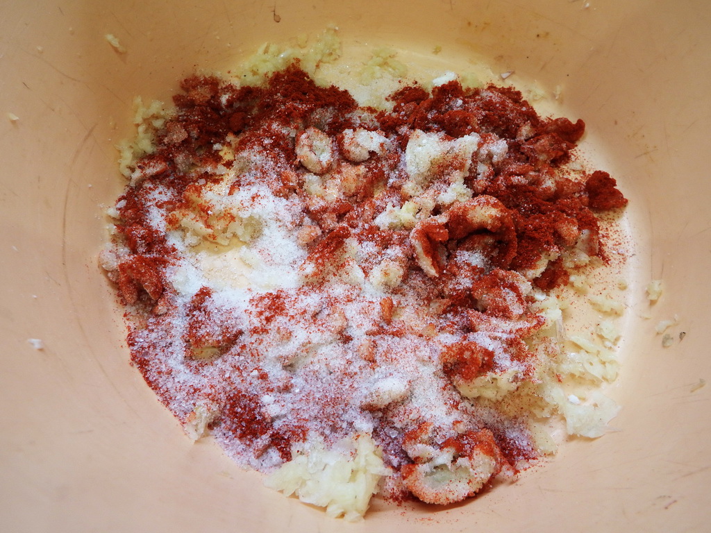 Для сухого маринада вам понадобиться выдавить свежий чеснок через прес. Добавть равные части соли и сахара чтобы сбалансировать вкус. Из специй можно добавить только подкопченную сладкую паприку. Не кладите ни черный перец, ни лавровый лист. Эти специи дают кислотную реакцию и при дальнейшем хранении у мяса получается специфический запах.