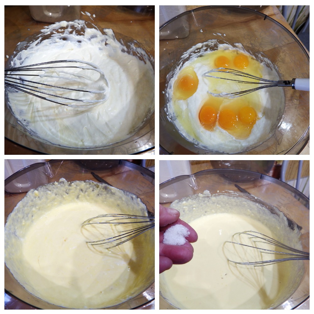 Вот взбили до белого цвета, добавляем яйца и щепотку соли. И так же все тщательно взбиваем.