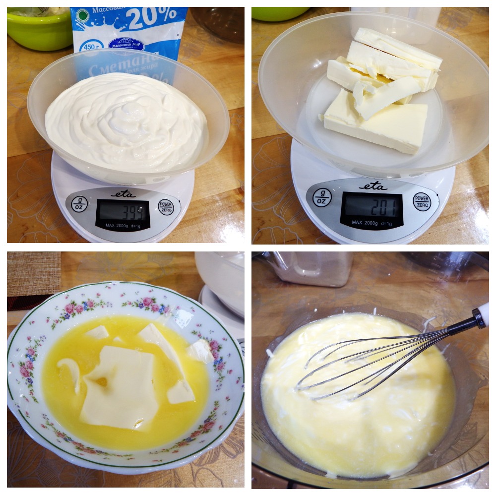 Итак, берем сметану и в нее добавляем растопленное сливочное масло и тщательно его растворяем в сметане. Желательно венчиком взбивать не долго, иначе можем получить повторно сливочное масло.