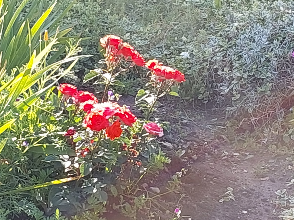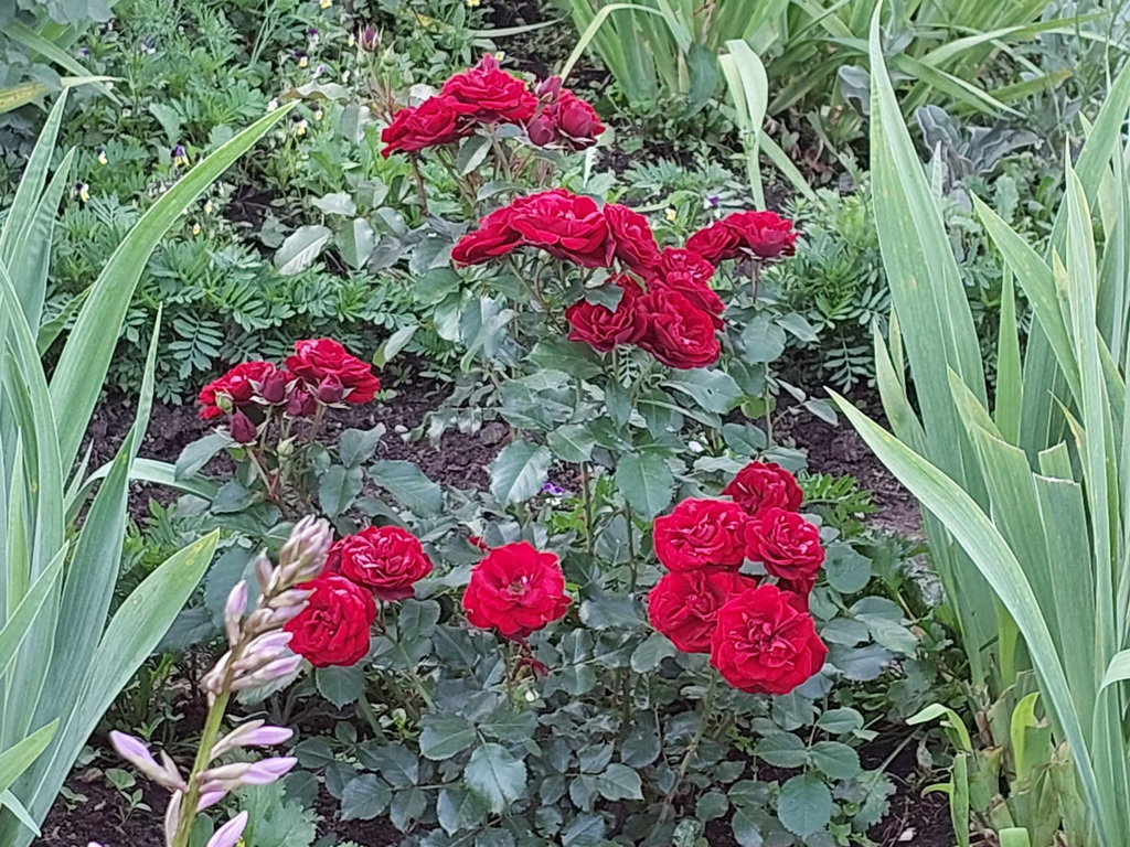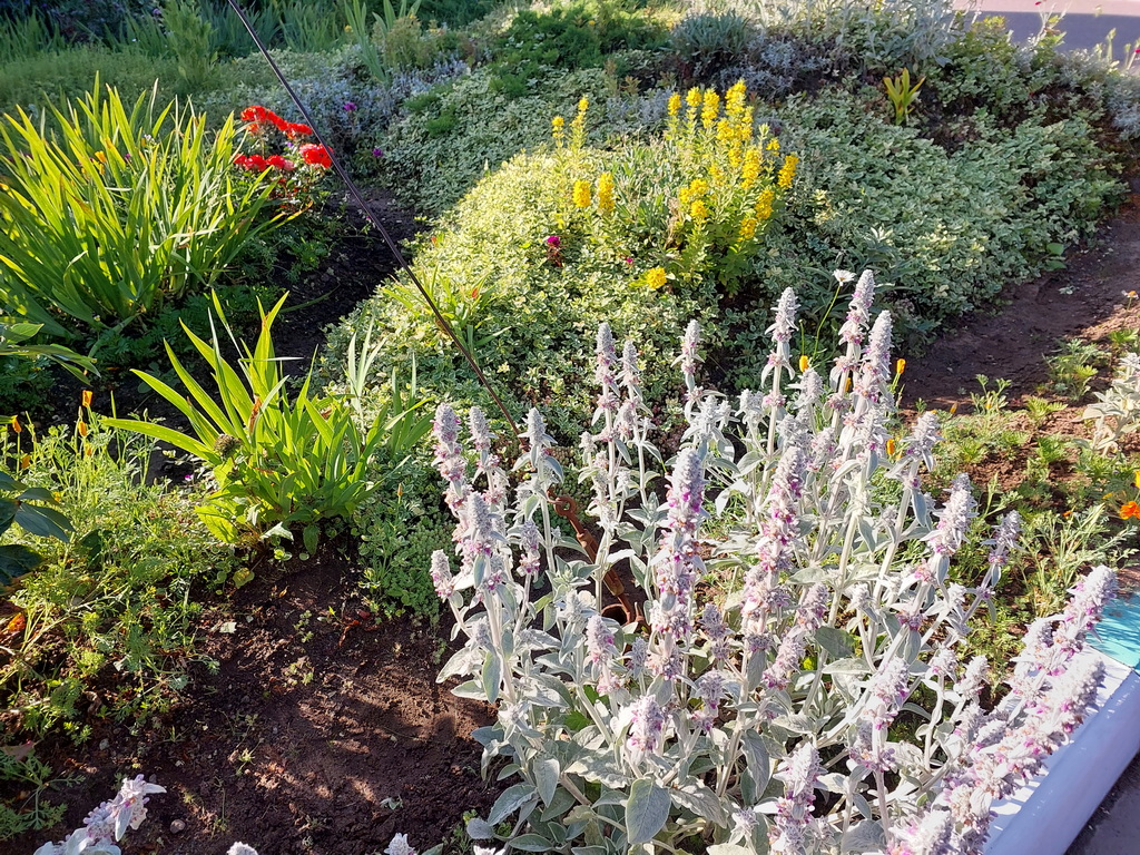 Розарий очень красив. Листья роз блестят так, как будто их смазали маслом, а лепестки красуются бархатом.