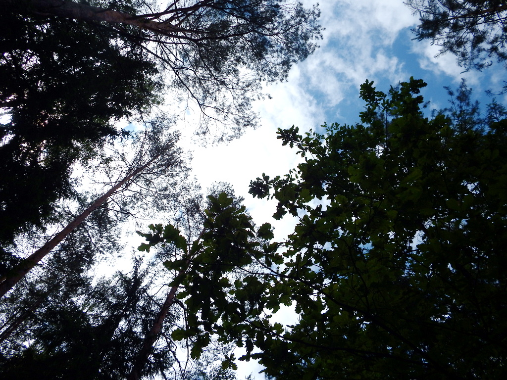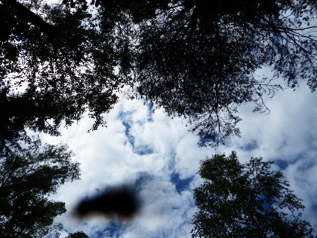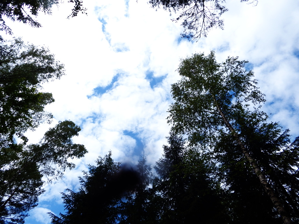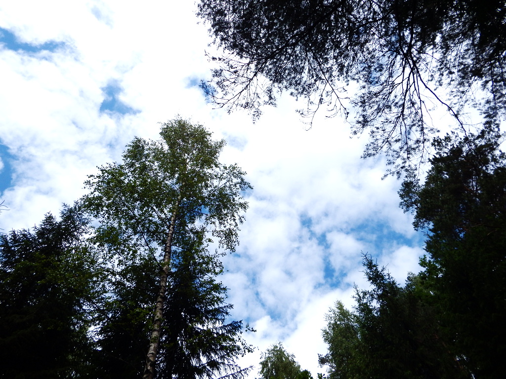 Вот и в прошедшие выходные мы везли родственников в лес за первыми грибами. Кто-то собирал грибы, такса наша гоняла по лесу, а я наслаждалась зеленой природой и лесным небом.